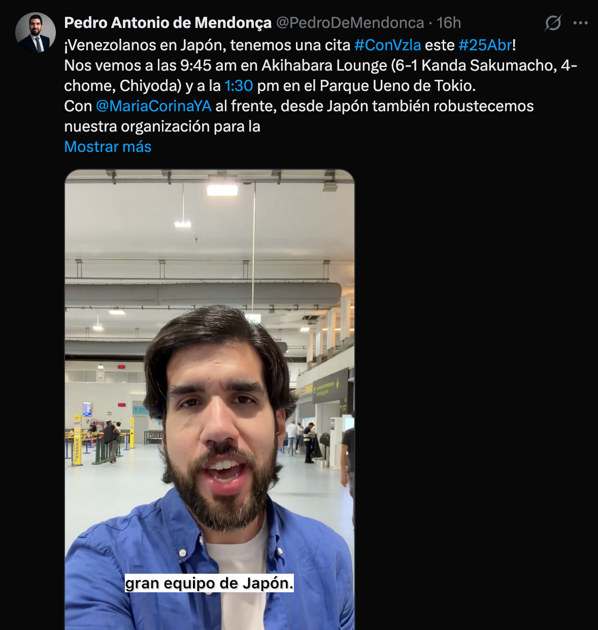 Este viernes 25 de abril, venezolanos residentes en Japón tienen una cita doble en Tokio: a las 9:45 de la mañana en el Akihabara Lounge, en el barrio de Chiyoda, y a la 1:30 de la tarde en el Parque Ueno. El encuentro es parte de la gira internacional de María Corina Machado bajo el lema #ConVzla — la misma que la tiene recorriendo el mundo mientras en Caracas se sigue debatiendo si habrá elecciones y cuándo.